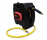 Катушка для воздуха. Металлический корпус, внешний диаметр Ø33 см, широкое внутреннее пространство и легкость подкатки, без усилия. Угол поворота шарнирного механизма 180° обеспечивает широкую рабочую зону захвата. Длина шланга: Ø15 м. Диаметр: Ø8 х Ø12 мм. Резьба : 1/4".
