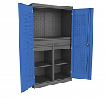 Шкаф инструментальный серии «PROFFI» предназначен для хранения оснастки, приспособлений и инструмента на рабочих местах в мастерских, цехах и других производственных зонах. Шкаф изготовлен из листовой стали и обеспечивает надежное запирание дверей ригельной системой. Шкаф содержит четыре ящика, одна перегородка и восемь полок. Размеры:(ВхШхГ) 1800x1000x500 мм. Масса: 71,4 кг. Нагрузка на полку – не более 100 кг. Нагрузка на перекладину - не более 15 кг. Суммарная нагрузка на шкаф не более 400 кг.