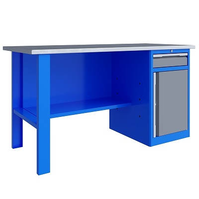 Верстак однотумбовый поставляется в разобранном виде. Нагрузка на столешницу до 600 кг. Стандартный цвет: корпус - серый глянец RAL 7030, ящики и двери тумб - синий RAL 5017. Размеры:855x1400x700 мм. Вес: 79 кг.