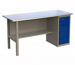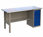 Однотумбовый. Допустимая нагрузка на столешницу 750 кг. Опорные элементы выполнены сварными из холоднокатаной стали. Верстак состоит из столешницы, опоры, тумбы P4 с двумя малыми и двумя большими ящиками и полки-стенки. Все металлические элементы покрыты полиэфирной порошковой краской. Столешница состоит из фанеры марки ФСФ толщиной 24 мм, которая покрыта лаком-антисептиком и листом оцинкованной холоднокатаной стали толщиной 1,2 мм. Размеры (ВхШхГ) 855x1396x696 мм.