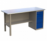 Однотумбовый. Допустимая нагрузка на столешницу 750 кг. Опорные элементы выполнены сварными из холоднокатаной стали. Верстак состоит из столешницы, опоры, тумбы P5 с четырьмя малыми и одним большим ящиком и полки-стенки. Все металлические элементы покрыты полиэфирной порошковой краской. Столешница состоит из фанеры марки ФСФ толщиной 24 мм, которая покрыта лаком-антисептиком и листом оцинкованной холоднокатаной стали толщиной 1,2 мм. Размеры (ВхШхГ) 855x1396x696 мм.