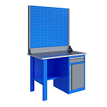 Однотумбовый. Допустимая нагрузка на столешницу 750 кг. Опорные элементы выполнены сварными из холоднокатаной стали. Верстак состоит из опоры, тумбы P7 с дверью и двумя полками и полки-стенки. Все металлические элементы покрыты полиэфирной порошковой краской. Столешница состоит из фанеры марки ФСФ толщиной 24 мм, которая покрыта лаком-антисептиком и листом оцинкованной холоднокатаной стали толщиной 1,2 мм. Размеры (ВхШхГ) 855x1196x696 мм.