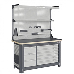 Нагрузка на столешницу 1500 кг. Столешница из листа влагостойкой фанеры марки ФСФ толщиной 40 мм и листом горячекатаной стали толщиной 5 мм. Рама верстака выполнена их холоднокатаной стали. Модуль верстака выполнен сварными. Ящики в модулях устанавливаются на шариковых телескопических направляющих полного выдвижения. Квадратная перфорация для установки крючков, держателей. Размеры: 1982x1493x743 мм