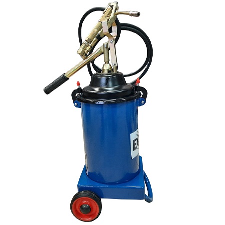 Нагнетатель смазки пневматический мобильный для шприцевания консистентной смазкой (солидолонагнетатель) производительностью 800 г/мин. Объем бака – 16,2 кг. При давлении воздуха 6-8 Атм давление смазки 350-400 Атм максимально. В комплекте раздаточный пистолет с жестким наконечником, адаптер для подключения 1/4”, шланг 5 м. Габариты: 320X360X890 мм, масса 12,8 кг.