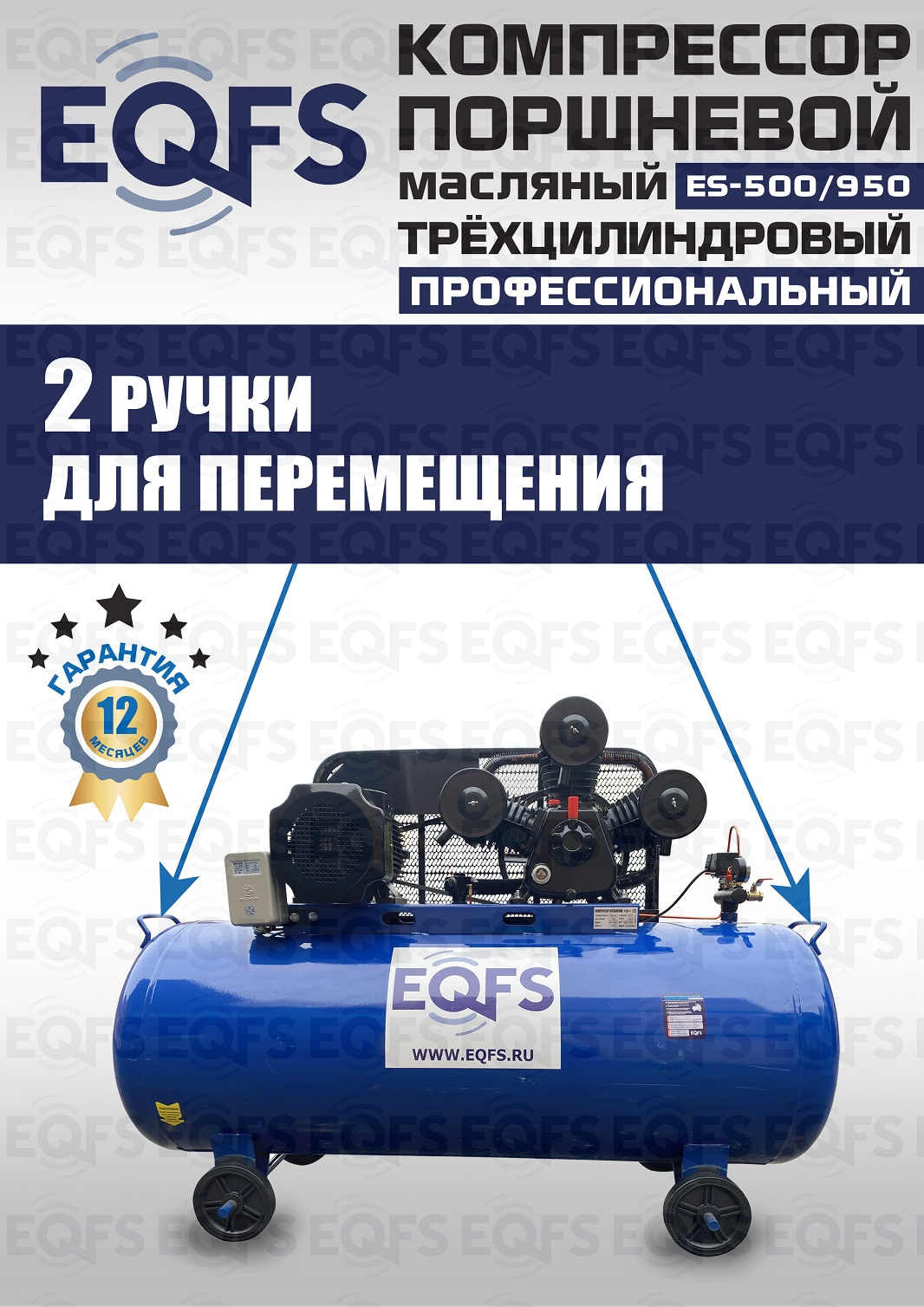 Компрессор воздушный, передвижной, поршневой, масляный, трёхцилиндровый. Быстро достигает нужного давления. Трёхпоршневая головка двигателя уменьшает износ деталей и увеличивает срок службы. Ремённый привод — предохранят мотор от поломки. Идеальное решение для шиномонтажа, автосервиса, строительства, покраски, промышленности. Давление 8 Атм. Производительность 950 л/мин. Мощность 7,45 кВт. Напряжение 380В. Ёмкость ресивера 500 л. Гарантия 12 месяцев.