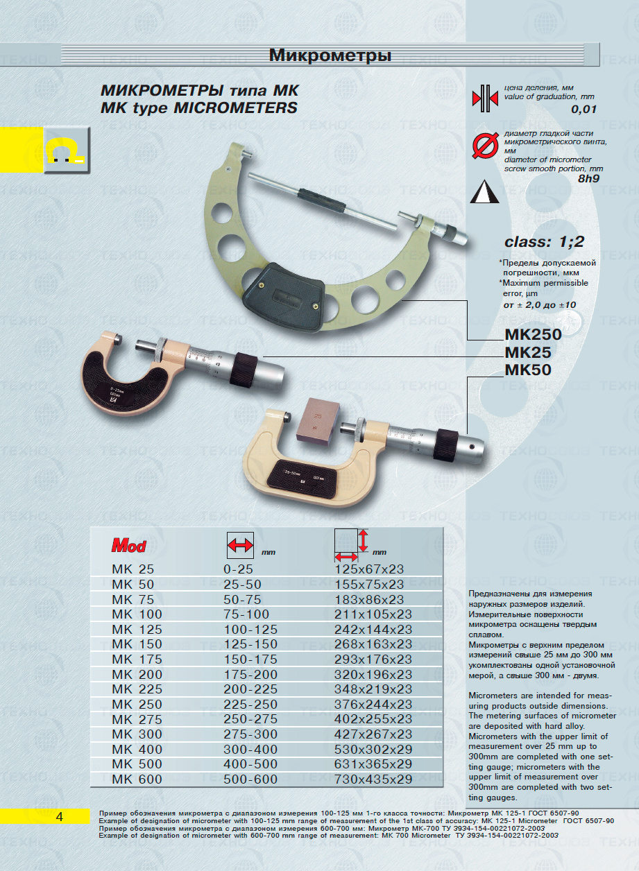 Цена деления 0,01 мм. Диапазон измерения от 0-25 мм. Микрометры МК предназначены для измерения наружных размеров изделий. Измерительные поверхности микрометра оснащены твердым сплавом. Микрометры с верхним пределом измерений свыше 25 мм до 300 мм укомплектованы одной установочной мерой. Класс точности - 1. ГОСТ 6507-90. Поставляется в двух вариантах с поверкой и без поверки!