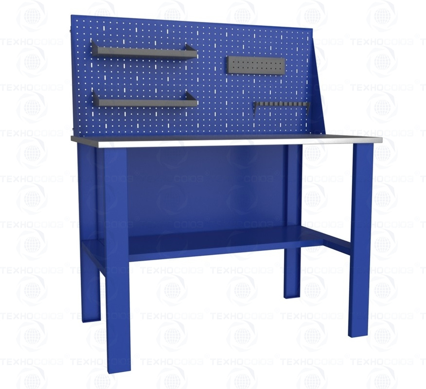 Столешница полностью фанерная и сверху покрыта слоем оцинкованного металла в 1 мм. Толщина фанеры составляет 24 мм. Столешница монтируется на опоры, произведенные из листового металла. Слесарный стол имеет максимально простую конструкцию, включающую одну нижнюю полку, столешницу и 4 опоры. Представленная модель изделия не имеет перфорированного экрана.