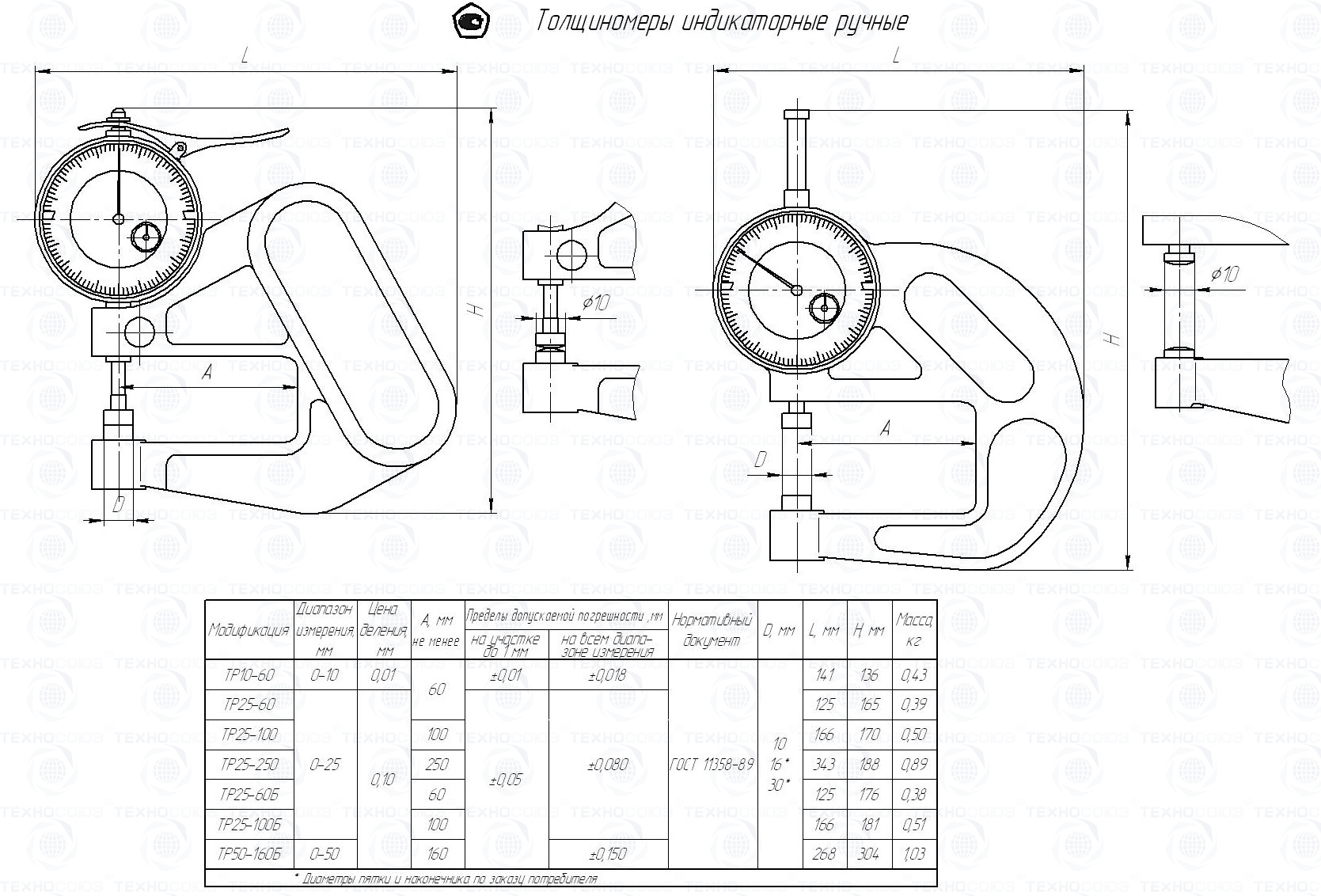 Диаметр измерительных поверхностей пятки и наконечника 10 мм. По заказу потребителя толщиномеры могут быть изготовлены с измерительной поверхностью диаметром 16 и 30 мм.