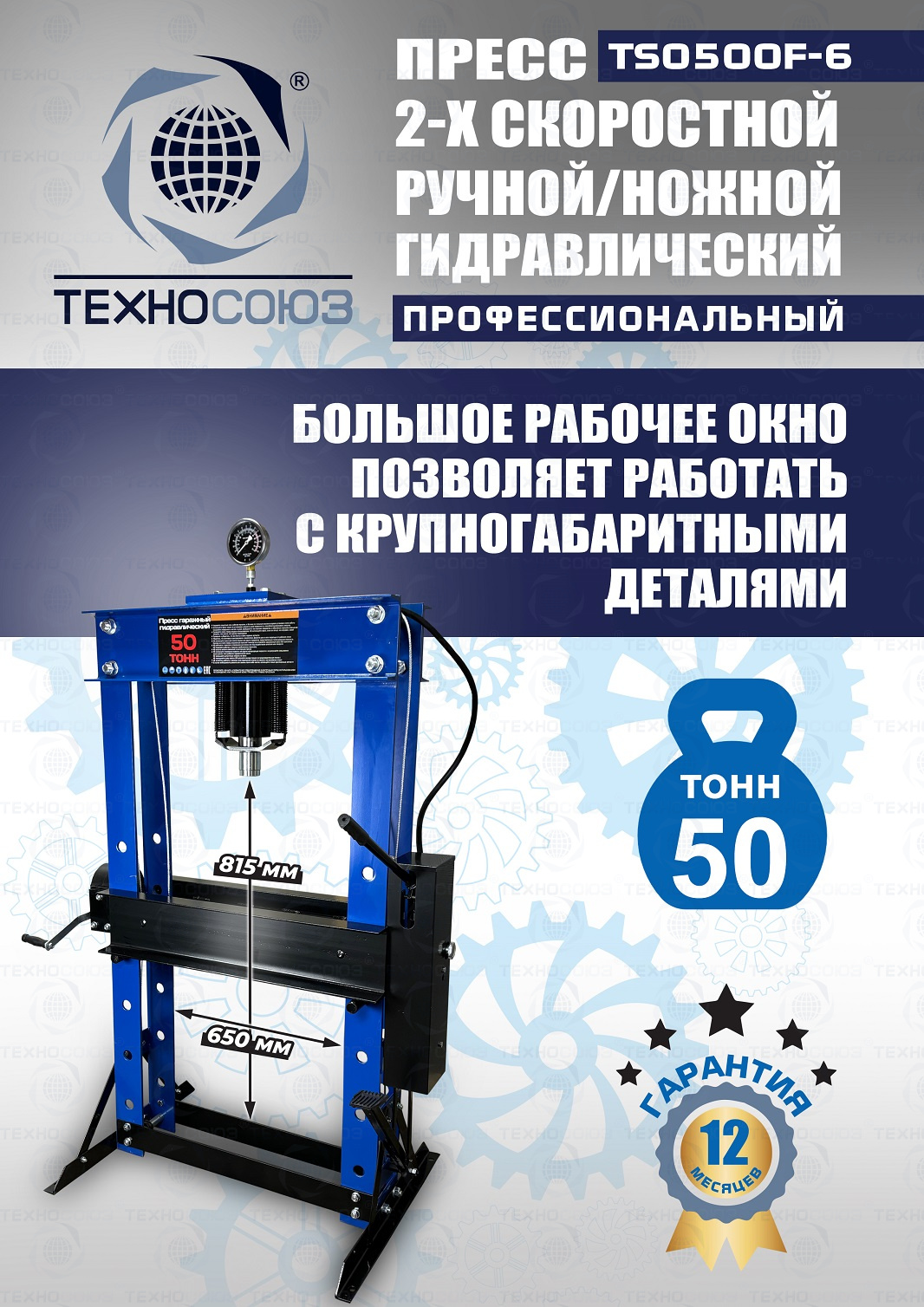 Пресс гидравлический ножной / ручной для автосервиса, усилие 50 т. «Свободные руки». ножной / ручной 50 тонн. Пуансон 0-230 мм. Рабочее окно 650х815 мм. Доставка по РФ и ТС. Поршень приводится в действие нажатием на ручку или педаль. Рекомендуется для выпрессовки деталей машин, втулок и т.п. в автосервисе, гараже и СТО. Цвет синий.